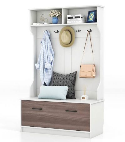 Entryway Bench Coat Rack Shoe Storage Cabinet in White Oak Wood Finish