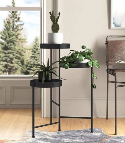 This Modern Black Metal 3-Tier Flower Pot Plant Stand lets your plants be the star with its simple, understated frame. This stand is crafted from metal with an open, staggered-height design that makes the room appear larger. Each tier features a circular platform with a raised perimeter that collects spills and splashes during watering and keeps plants and decor from sliding off. We love that each tier rotates around its center support, allowing for customization. Best of all, this plant stand comes fully assembled, so itÂ’s ready to go from the moment it arrives.