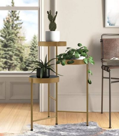 This Modern Gold Grey Metal 3-Tier Flower Pot Plant Stand lets your plants be the star with its simple, understated frame. This stand is crafted from metal with an open, staggered-height design that makes the room appear larger. Each tier features a circular platform with a raised perimeter that collects spills and splashes during watering and keeps plants and decor from sliding off. We love that each tier rotates around its center support, allowing for customization. Best of all, this plant stand comes fully assembled, so itÂ’s ready to go from the moment it arrives.