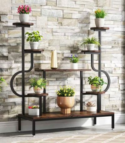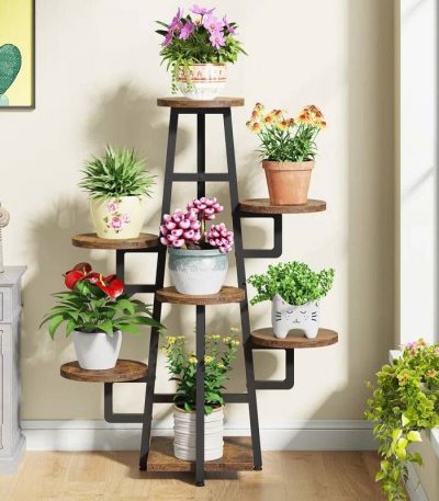 • 7 Potted Plant Stand: The warm wood tonal finish meets a rigid black metal frame in retro industrial style, while accented with chic high and low-layer round shelf designs, this plant stand for indoor plants is the best artwork to display your favorite potted plants, providing you a refreshed air to your busy life and set your mind free.