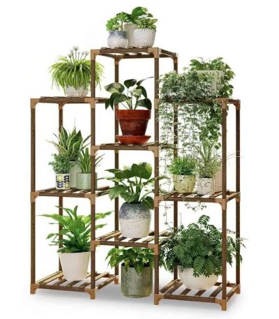 Unique design capable of holding 9 pot plants. The Natural Wood Bookcase Plant Stand Shelving Rack – Holds up to 9 Planters can be used as a decorative piece to organize your selection of plants. The stand is suitable for use indoors and outdoors.