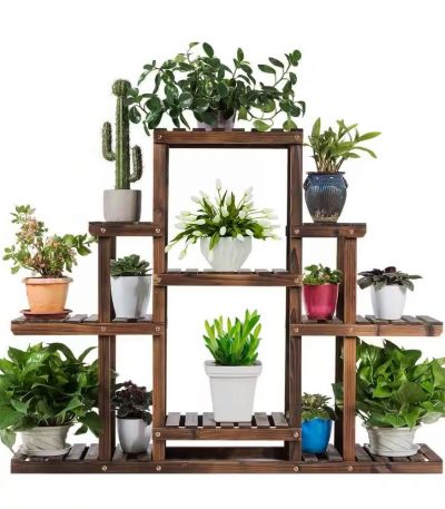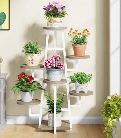 This Modern Industrial Indoor Multi-Tier Plant Stand with White Metal Frame is made of solid carbonized pinewood, a natural material with no harmful substances. The triangular shape not only increased its weight capacity but it can made each plant pot enjoy the sunshine. Multi-tier it can hold at least 6 potted plants. A great addition to the garden, balcony, yard, and flower shops, as well as a nice gift for moms, and girlfriends. This wood flower stands with high and low designs and evenly slats with hollow designs, good for drainage and ventilation, which is a benefit for plantsÂ’ growth. We added wheels at the bottom, so you can easily remove them for outdoor or indoors, garden, patio, greenhouse, etc.
