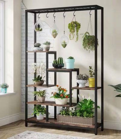 This Modern Industrial Heavy Duty Metal Wood Plant Stand with 10 Hanging Hooks is really a great addition to your living room, balcony, entryway, garden, yard, flower shops. 5 Design Details For Your Plant Life. — Curved Design: An irregular structure makes your plants look more layered–Multi-tiered Design: Different heights of high and low design, suitable for most different plants. — Ladder Design: Can hold at least 16 potted plants(Depending on their size) — Multi-functional Design: This display shelf for plants, photos, handicrafts, books, toys in the living room, office, garden. — Freely Combination Design: Choose the two units together or keep them separate for your corner.