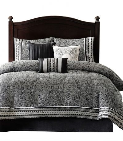 California King size 7-Piece Comforter Set with Black Grey Damask Pattern