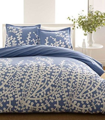 Full / Queen 100-Percent Cotton 3-Piece Comforter Set with Blue White Floral Branch Pattern