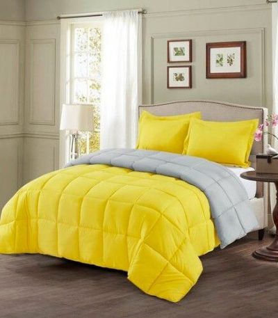 Full/Queen Traditional Microfiber Reversible 3 Piece Comforter Set in Yellow/Light Gray