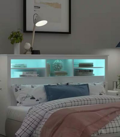 Full / Queen Modern Bookcase Headboard with LED Lights in White Wood Finish