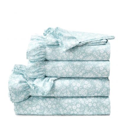 King Size Polyester Blue Ruffle Floral 6 Piece Sheet Set