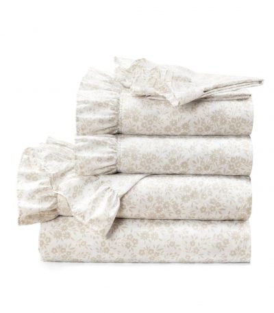 King Size Tan White Floral Ruffle Polyester 6 Piece Sheet Set