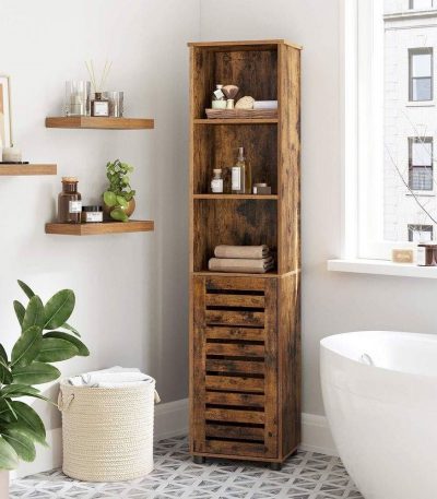 - 2 IN 1 DESIGN: Perfect combination of shelf and storage cabinet; 4 shelves provide ample storage space in bathroom for towels, toiletries, etc., the roomy cabinet with slatted door can store infrequently used items and keep them from dirt