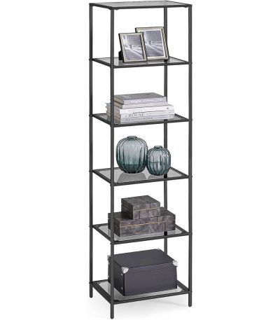 Narrow Glass Shelves Bookcase 5-Shelf Shelving Unit with Black Grey Metal Frame