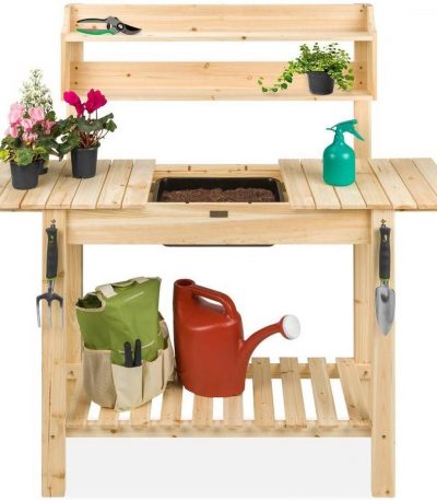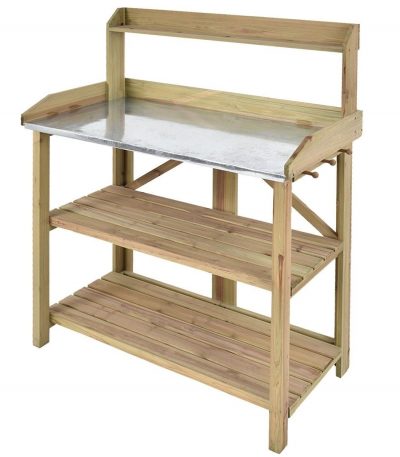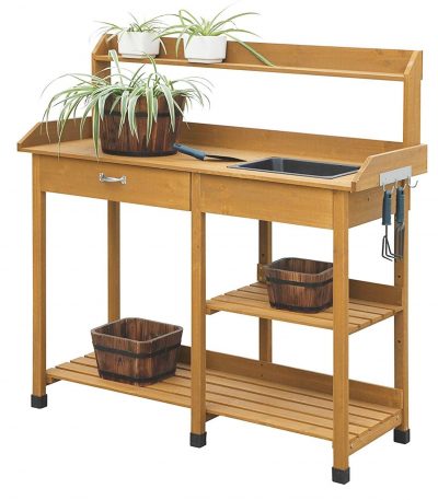 $338.02Natural Fir Wood Potting Bench Garden Work Table with Metal Top Metal plated tabletop is durable, easy to clean, and gives you ample space for all your gardening needs Spacious cabinet with a metal closure, large bottom shelf, and sliding drawer provide more than enough storage for garden supplies and pots Convenient upper shelf holds potted plants and 3 hanging hooks on the side allow your gardening tools to be at armÂ’s reach Constructed of natural fir wood, this potting bench can be customized to your liking with wood stain, varnish, or paint