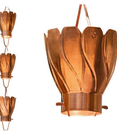 $213.66Copper 8.5 Ft Floral Petal Cups Rain Chain Dimensions: 4L x 4W x 102H in. Handcrafted from copper Natural copper finish 14-cup chain Triangular hanger included Material: Copper