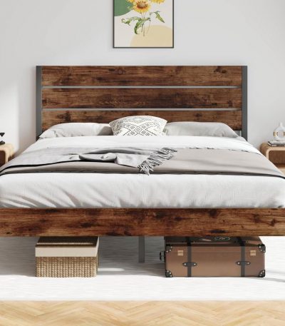 Queen size Modern Farmhouse Metal Platform Bed Frame with Brown Wood Headboard