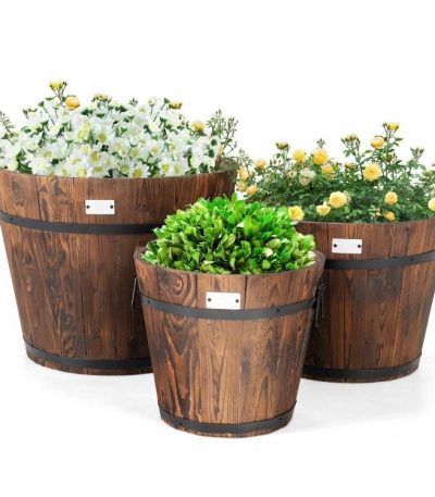 Set of 3 Outdoor Wooden Barrel Planter Pots with Handles 11.5, 15, and 18 inch