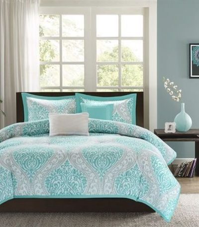 Twin / Twin XL Aqua Teal Turquoise Blue White Modern Damask Comforter Set
