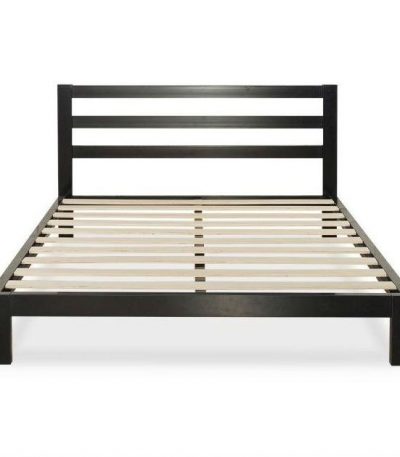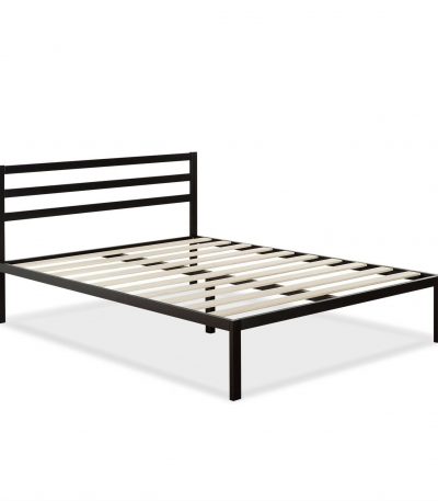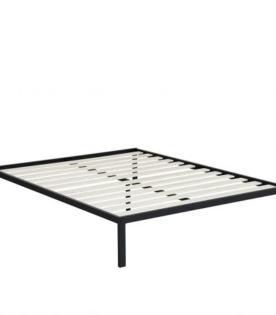 $338.02Queen Modern Black Metal Platform Bed Frame with Wood Slats Patent pending Quick Snap TM easy “no tool” assembly in minutes Includes openings in two of the legs to allow for attaching a headboard Extra Strong metal frame with wood slats less than 3 inches apart Mattress foundation that prevents sagging and increases mattress life Foam padded tape is added to the steel frame for noise-free use and non-slip tape on the wooden slats prevents your mattress from moving Eliminates the need for a box spring, mattress sold separately