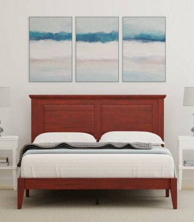 This Queen Size Retro Solid Oak Wooden Platform Bed in Cherry with prominent headboard is a must have for any bedroom! Inset panels and retro molding that adds refined elegance to any bedroom or guest room. It is crafted from solid oak, a naturally hard and durable wood. Platform bed sits on straight and slightly tapered legs that raise this bed almost 8 inches off the floor. This system of slats eliminates the need for a box spring and works best with any standard mattress (recommended 10 inches of thickness). Assembly is required.