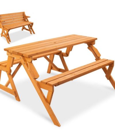 Get the best of both worlds with the Outdoor Interchangeable 2 in 1 Multi-Use Wooden Picnic Table Garden Bench Umbrella Hole. This unique furniture set up starts as a picnic table and transforms to a garden bench in seconds, allowing you and guests to enjoy lunch or simply lounge outside. Made from sturdy natural wood holds up to 4 people when used as a picnic table and 2 people when used as a bench; made lightweight to allow for easy mobility. Also includes 1.5-diameter hole in the table top/backrest will fit most standard umbrellas, so you can provide a shady atmosphere anytime of day.