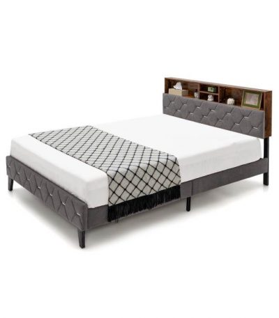 Covered with skin-friendly velvet fabric and padded with high-density sponge, this Queen Size Velvet Upholstered Open/Close Storage Headboard Platform Bed provides you with ultimate comfortable and storage! Comes with a storage headboard that also features a hidden space and 4 open compartments, not only protecting your privacy but keeping items close to hand. Premium hydraulic rods allow you to open/close the headboard. Supported by 12 strong plywood slats and sturdy metal frame, this modern upholstered bed ensures 1000 lbs. max load capacity. Recommended Mattress thickness (NOT Included) is 10-12 inches and bed has 6 inch clearance from floor.