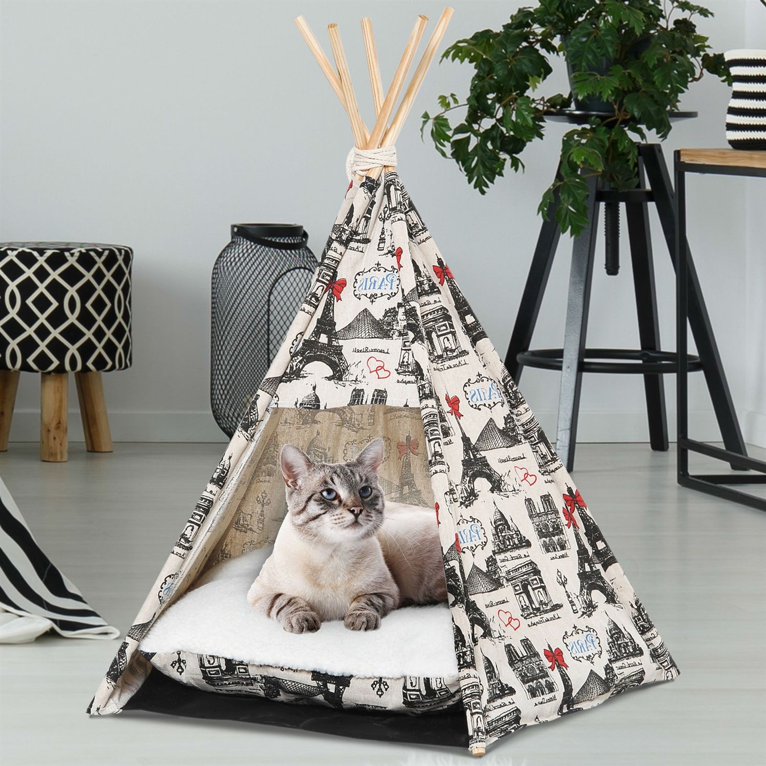 This cute and chic Cotton Foldable Teepee Tent Cat Dog Bed House Paris Theme is a great a decorative accent to any room while providing a private space for your small pet to take a nap or hide themselves. Made of 100% natural wood and cotton canvas. Also includes a thick padded mattres! This will surely become your pet’s favorite spot in the house. Easy to assemble and lightweight, it can be easily moved from one place to another.