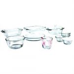 - Set includes: (1) 2-quart bake, (1) 1 1/2-quart casserole with glass cover, (1) 1 1/2-quart loaf, (1) 1-quart mixing bowl, (1) 9-inch pie, (1) 8-ounce measuring cup, (4) 6-ounce custard cups with plastic lids