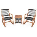 Just sit back and rock the night away! This 3-piece rocking bistro set includes a side table (18″ L x 18″ W x 18″ H) and 2 rockers (33″ L x 24″ W x 36″ H), to create a cozy space for any/all outdoor enjoyment. This rocking bistro set features hand-woven plastic rope, making sure you rock in comfort and style. Come made from solid acacia wood, burr-free surface, and a reinforced crossbar for extra stability.