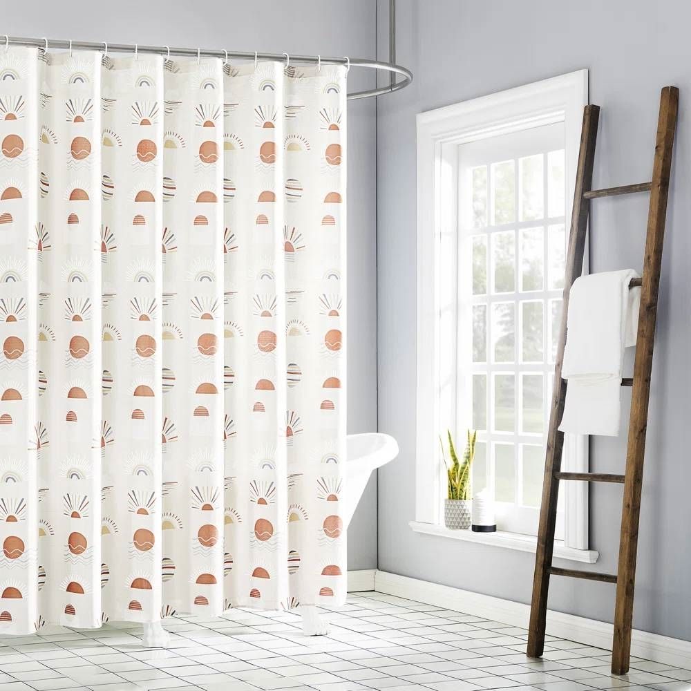 Breathe new life into your bathroom decor with the 72-inch Cream White Orange Sunset Bohemian Pattern Shower Curtain. Showcasing a boho inspired printed design, this 72-inch Cream White Orange Sunset Bohemian Pattern Shower Curtain is the complete solution to keeping floors free of splashing water. The buttonhole top design allows for easy ring installation and sturdy hanging. This set includes 1 printed shower curtain, 12 plastic rings for easy sliding, and 1 mini tote printed with the same design. The water-resistant mini tote is great for toiletries, shoes, the beach, shopping, or lunch on the go. Machine wash cold on gentle cycle. Use non-chlorine bleach when needed. Tumble dry on low heat, using a cool iron as needed.