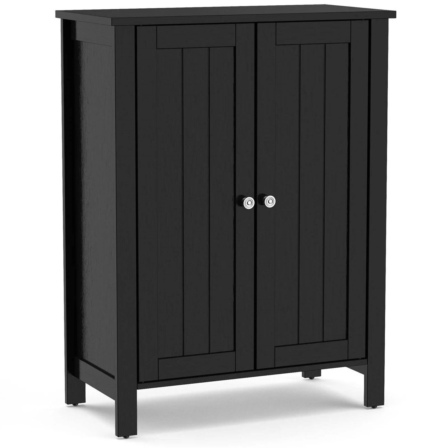 This Bathroom Storage Cabinet with Adjustable Shelves in Black Wood Finish features 2-tier storage shelves inside, which offers you ample storage space to hold towels, toilet articles, cosmetics, etc. Besides, 2 shelves can be adjusted with 6 positions to meet your different storage height requirements. Made of premium MDF and engineered wood, this bathroom storage cabinet is sturdy and durable for a long lifespan. And the overall structure is very stable and not easy to shake. It is equipped with anti-skid foot pads to prevent the floor from being scratched. The storage organizer can be used as a bathroom cabinet, sideboard, console table, or shoe cabinet to satisfy your various needs. With clean lines and elegant style, the cabinet can easily blend into any decor. It is perfect for the bathroom, living room, bedroom, corridor, and more. The closed storage room with double doors can keep your stuff dry and clean. 2 metal knobs make it convenient to open and close. In addition, the storage cabinet is designed with a wall anchor kit to avoid tipping over and wobbling for extra safety. The Bathroom Storage Cabinet with Adjustable Shelves in Black Wood Finish comes with clear and brief instruction, which has straight forward illustrations and descriptions. Each screw and pin has its own code to take you little time and energy. And its smoothly painted surface is waterproof and easy to keep clean.