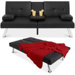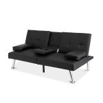 Enjoy the best in comfortable lounging with this Black Faux Leather Convertible Sofa Futon with 2 Cup Holders. This convertible sofa futon is made with faux leather and 4 chrome metal legs to bring sleek style to any room. The sofa futon reclines easily and can be converted into a guest bed. Relax with family or friends and use the 2 cup holders enjoying your favorite drinks.