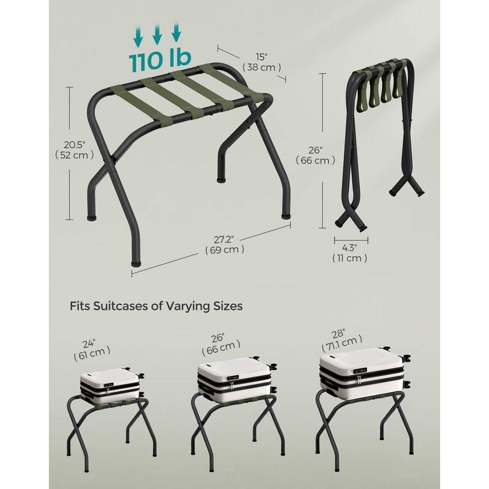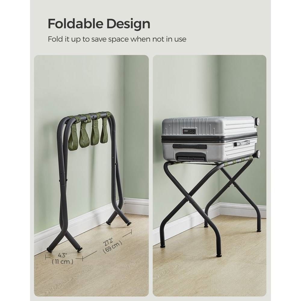 - Black Metal Foldable Luggage Rack with Forest Green Straps