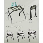 Make your guests’ stay more comfortable with this Black Metal Foldable Luggage Rack with Forest Green Straps. It keeps the luggage off the floor to save you or your guests from bending down to the floor, making packing and unpacking for trips much more easier. Fastened to the steel frame, the nylon straps will always stay in place without moving during use; the suitcase stand is strong to hold up to 110 lb; the adjustable feet improve the stability and won’t scratch the floor. This luggage rack conveniently folds to a size of 27.2”D x 4.3”W x 26”H (69 x 11 x 66 cm) for easy storage in smaller spaces. Its standing size of 27.2”D x 15”W x 20.5”H (69 x 38 x 52 cm) can accommodate 22”, 24”, or 26” suitcases. With clear instructions and an Allen key included, you can set up this luggage rack effortlessly, ready to help with the packing for the next trip. A steel luggage rack for guest rooms with a foldable design, adding extra storage while being a nice touch to any room.