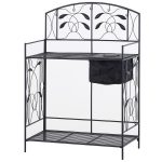 In a world full of wood potting benches, this Black Metal Potting Bench with Wrought Iron Vine Details and Fabric Potting Sink really knows how to stand out. Finished in classic black and featuring impressive scrollwork and vine details throughout, this potting bench is as charming as it is functional. Integrated hooks all along the top give you plenty of places to hang your gardening tools, while the ample workspace and fabric potting sink help you get your work done. The lower shelf is perfect for storing boots, bags of potting soil or extra pots. Some assembly is required. Easy to maintain. Working surface height is 30 inches.