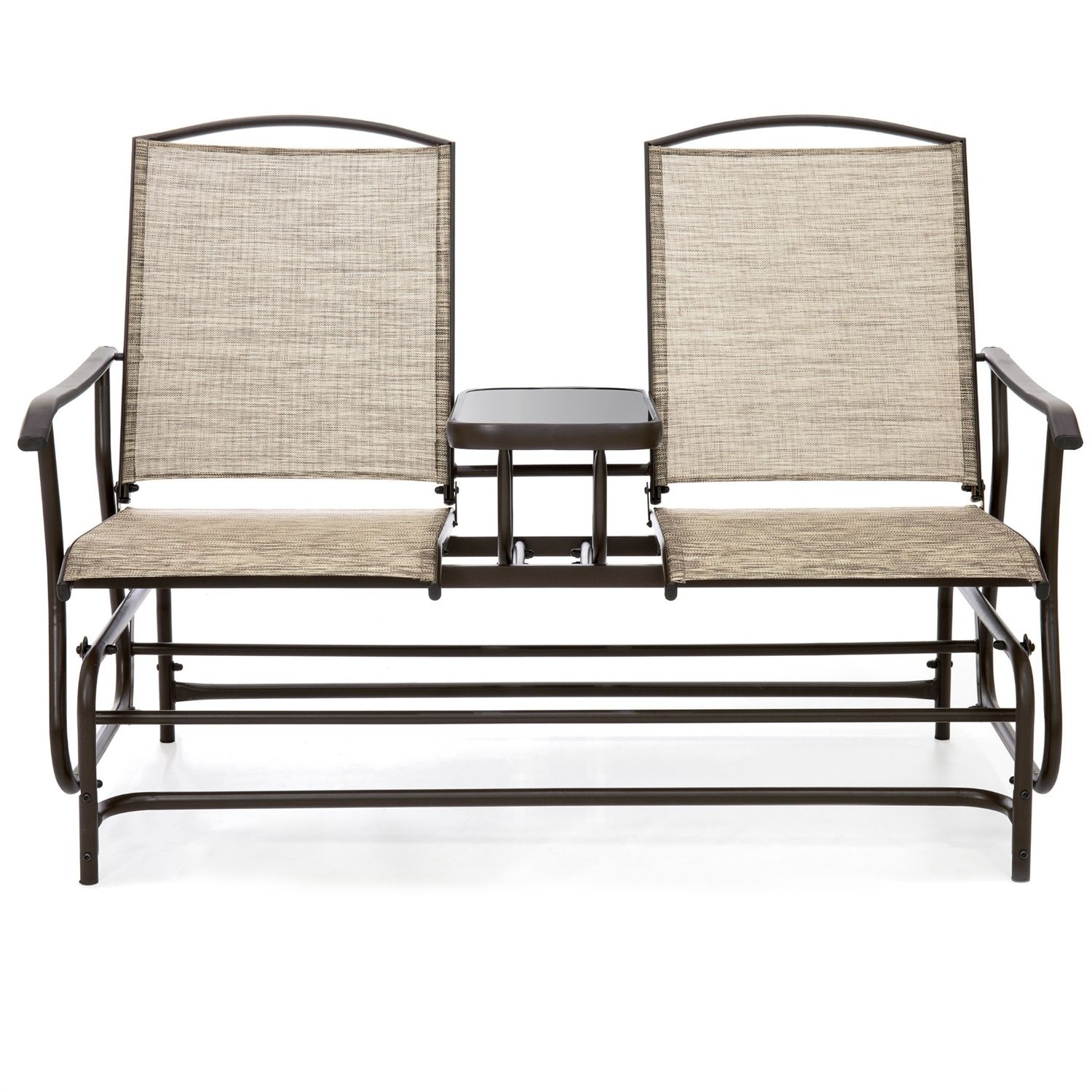 Relax and sip the night away at home in style with the Brown 2-Seater Outdoor Mesh Double Glider Tempered Glass Attached Center Table. Perfect for afternoon lounging or a relaxing date, built with an elevated tempered glass center table for snacks and beverages. Combination of mesh fabric on a sturdy steel frame for maximum durability through the years. For stability with style, the seat frame connects to 4 rocker arms to easily glide front to back. Designed with armrests and a high back for substantial support and comfort