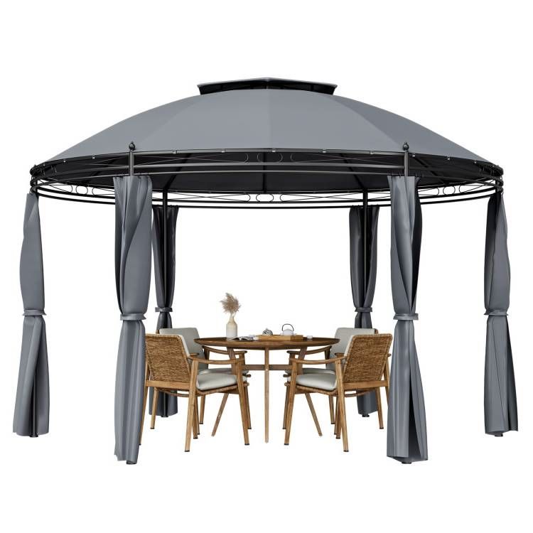 Enjoy all of outdoor leisure time and escape the elements with this Circular Dome Hexagon Gazebo w/ Polyester Privacy Curtain in Grey. This patio gazebo has a double-roof design that facilitates convection and circulation of hot and cold air, promoting good ventilation and keeping cool under the gazebo. This outdoor steel gazebo is equipped with 6 side curtains, which is connected by hook and loop fasteners. They are removable with convenient hooks and can be easily put down to provide excellent privacy. When you don’t need to use them, you can store the curtains to one side with hook and loop fasteners to provide full ventilation. This 11.5 ft x 11.5 ft outdoor gazebo has an elegant round shape, which is perfect for any outdoor decor, such as patio, courtyard, garden, deck, etc. In addition, the spacious gazebo is enough to accommodate 4-5 people for dinner, gathering or chatting under it. The top of this gazebo is made of 160g high-quality polyester cloth with waterproof PA coating and the curtains are made of 130g polyester cloth.