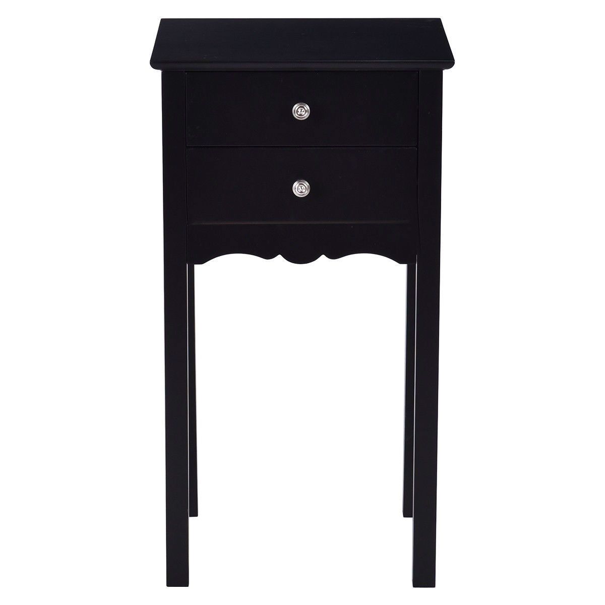 Elegant 2-Drawer End Table Nightstand Side Table in Black Wood Finish Brand new and high quality Modern and elegant style Constructed of high quality, non-toxic MDF material with a high gloss on the surface Two slide-out drawers for additional storage Vintage style metal handles Used as a living room side table or a bedside table For college dorms, guest rooms or any room Wipe-clean surface, easy to clean Assembly required Color: Black/White Material: MDF Package include: 1 x Side table