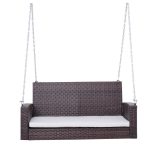 This Espresso Wicker Porch Swing 7ft Hanging Chain with Cream Padded Cushion has so much Southern charm it practically welcomes your guests and brings out a pitcher of sweet tea for you. Its generous size with curved armrests, a high back rest with super padded cream cushion, makes this classic 2 person porch swing a great backyard or porch addition.
