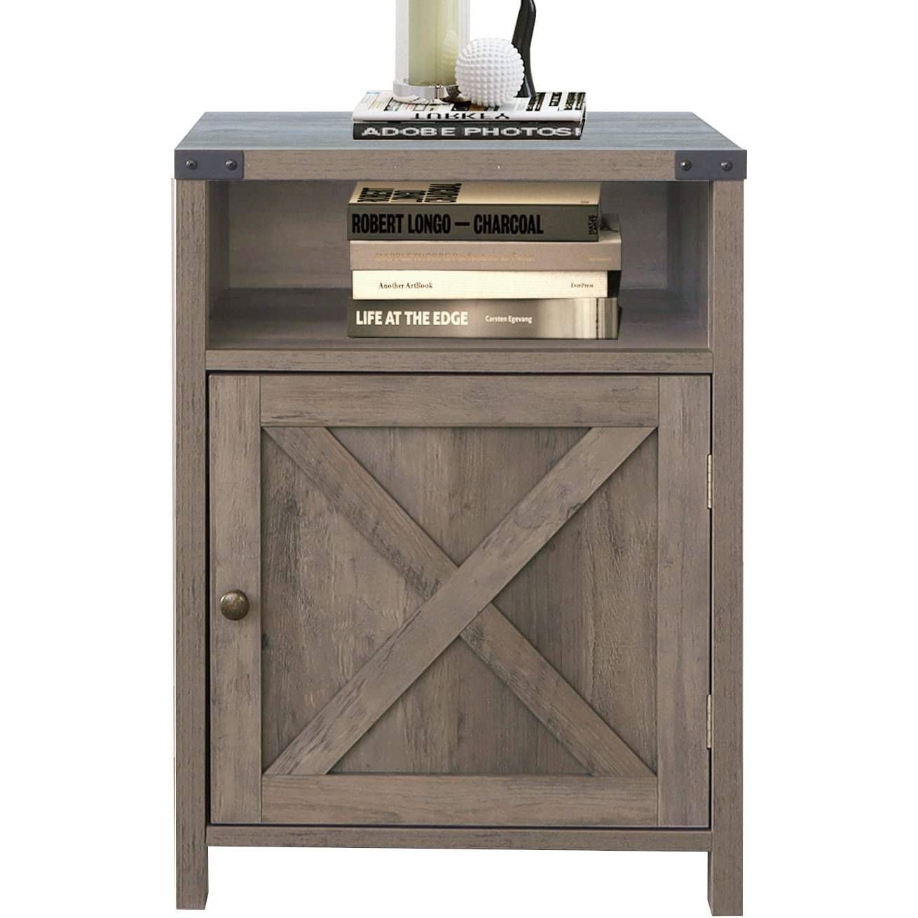 - This nightstand bedside table features X-frame barn door with farmhouse accent