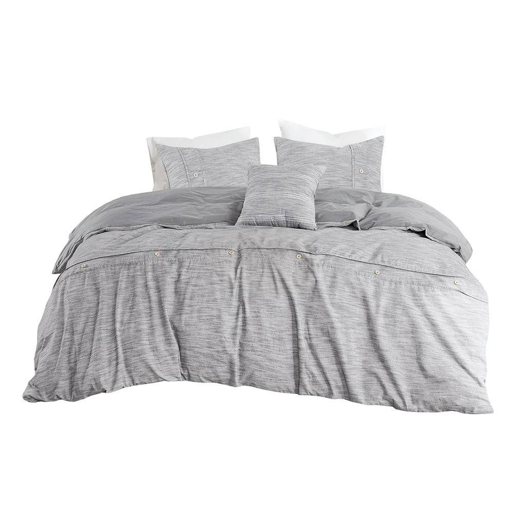 The Full / Queen size 5-Piece Grey Cotton Farmhouse Comforter Set offers a refreshing update to your bedroom. This GOTS certified organic cotton comforter cover features button placket details on the soft grey fabric, for a modern farmhouse look. A removable insert is included, and secured by corner ties and a button closure to make washing easier. The 2 matching shams also showcase button placket details that complement the oversized comforter cover, and a decorative pillow completes this bedding set. An antimicrobial treatment provides built-in freshness protection, reducing the growth of odor causing bacteria to keep fabric lasting longer. Items in the set may come in a rolled or compressed packaging, which will need to be fluffed up or steam ironed before use to remove wrinkles.