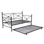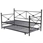 This Full size Black Metal Daybed Frame with Twin Roll-out Trundle is perfect for studio apartments, home offices, or guest rooms, daybeds are versatile additions to any abode. Crafted of metal in a semi-gloss black finish, this daybed strikes a rectangular silhouette with X-frame trellis panels, tall posts, and decorative ball finials. A slat system accommodates your preferred mattress (recommended 8″-thick, not included) without the need for a bulky box spring, while a roll-out trundle underneath accommodates a trundle mattress up to 6″-thick (not included).