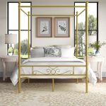 This Full size French Country Four Poster Metal Canopy Bed in Gold Finish showcases four posters for a stately, French country look in your bedroom. The clean-lined frame is crafted from stainless steel in a neutral finish, and it rests on round, 65″ tall legs for a spacious design. Both the open-frame headboard and footboard strike a rectangular silhouette, while floral designs in the middle add a classic touch to your space. This Full size French Country Four Poster Metal Canopy Bed in Gold Finish has center legs that provide additional support. Best of all, no box spring is necessary, so you’ll just need to add the fitting mattress of your choice (sold separately).
