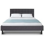 Full size Grey Mid-Century Modern Upholstered Platform Bed Frame with Headboard Upholstered platform bed features a classic stitched headboard and fits full-sized mattresses Includes wooden legs and slats for bed frame support, removing the need for box springs Designed with a contemporary low profile for a modern take on mid-century aesthetics The bed frame is crafted of durable wood and is complete with upholstered fabric No mattress included All hardware stored in a zip compartment in unit Overall Dimensions: 82”(L) x 58.5“(W) x 36.8“(H)