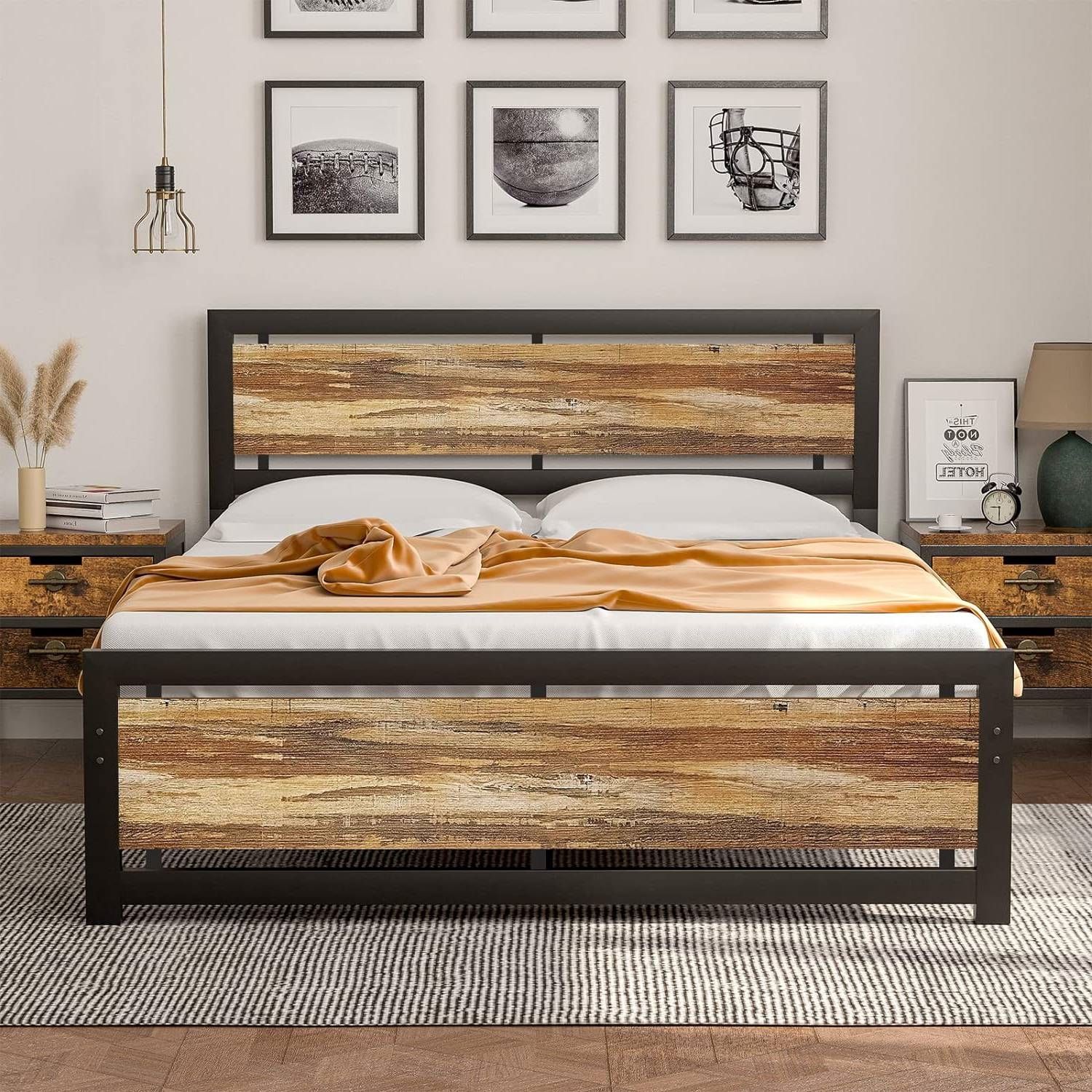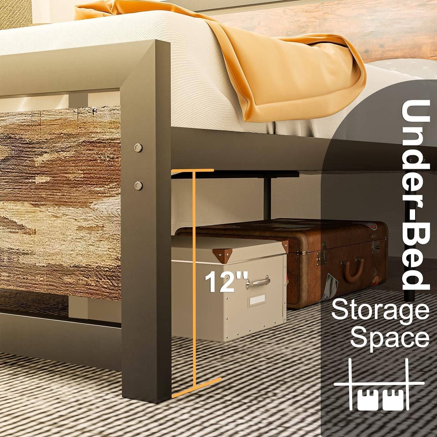 - Full size Industrial Platform Bed Frame with Wood Panel Headboard Footboard