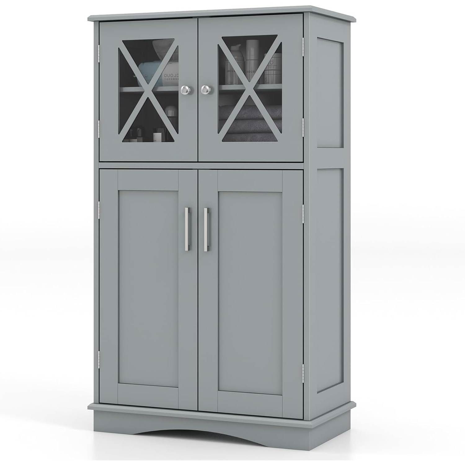 - Grey Bathroom Towel Linen Cabinet with Glass Doors and Storage Shelves