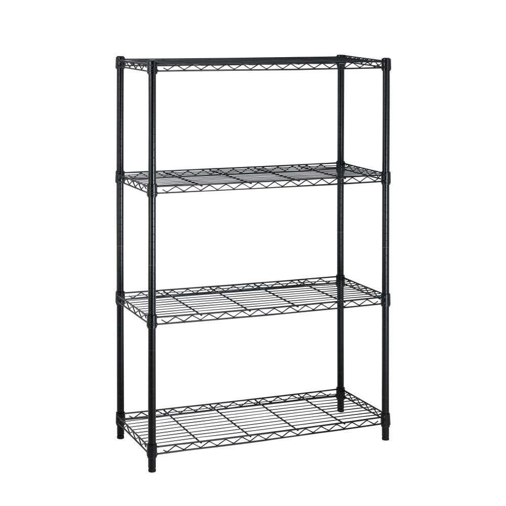 Heavy Duty 4-Shelf Metal Shelving Unit in Black Steel Finish EASY TO ASSEMBLE The storage shelves is easy to assemble, all parts packaged for idiots This wire shelf structure is very simple No tools required to assemble it The wire shelving unit is simple to assemble You only need to spend 15min to install it.storage shelves wire shelf wire shelving unit ADJUSTABLE You can adjust the height of the storage shelves according to the size of the item The spacing of each layer of this wire shelf can be adjusted shelves adjustable leveling feet allow the wire shelving unit to be placed on uneven ground A simple twist is all it takes to stabilize.wire shelving unit wire shelf storage shelves LARGE STORAGE AND STUDY This storage shelves provide an enormous amount of space and strong shelves The wire shelving unit doesn’t occupy too much space, but it can create more additional space The wire shelf total unit weight capacity is 1000 lbs. Wire shelf storage shelves wire shelving unit MULTIFUNCTIONAL This wire shelf is for a wide range of applications You can use this storage shelves in a variety of places, such as the bathroom kitchen garage Tools, books,household appliances and other things can be placed on this wire shelving unit Wire shelving unit storage shelves wire shelf 100% SATISFACTION GUARANTEE We guarantee youÂ’ll love this wire shelving But if youÂ’re not satisfied with this wire shelving, please get in touch with us