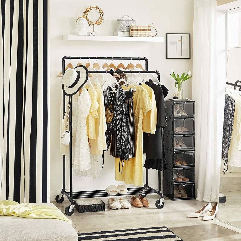 • For exceptional built quality, high weight capacity and convenient mobility – look no further than SONGMICS Industrial Pipe Double Rail Garment Rack.