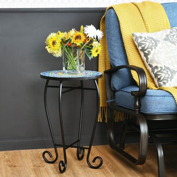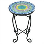 Indoor/Outdoor Blue Yellow Green Mosaic Round Side Accent Table Plant Stand