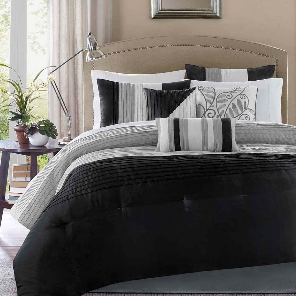 Relax in complete luxury with this King Size 7 Piece Bed In A Bag Comforter Set Faux Silk Black Gray Stripes. Sleek piping of the fabric on the comforter set and pillows gives a strong visual dimension. Everything is included with this jumbo set. Come with Comforter, Bed Skirt, 2 Pillow Shams, 3 Decorative Pillows! Machine wash, gentle cycle and separately. Tumble dry low. Spot clean decorative pillows.