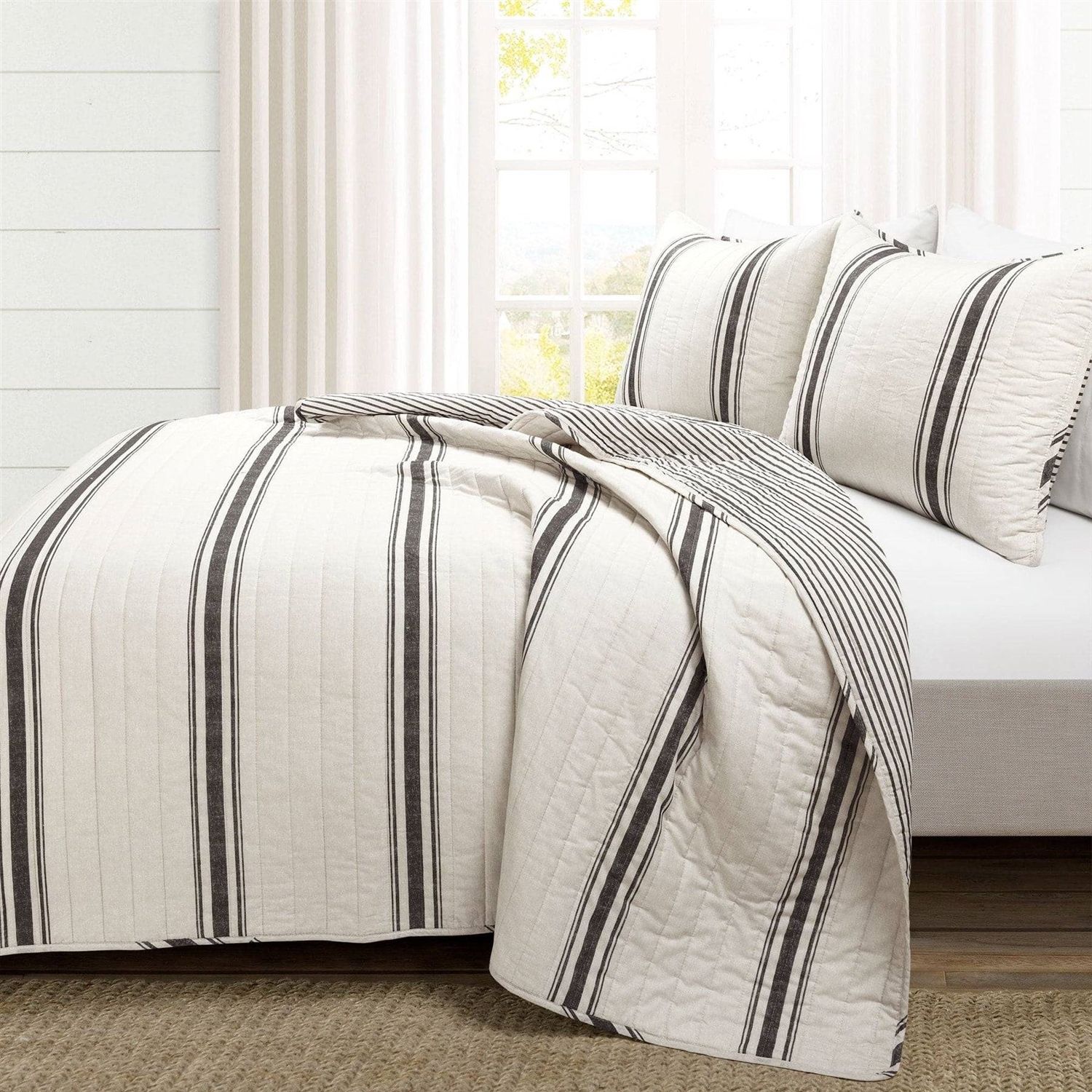 This Farmhouse Stripe Reversible Cotton Quilt Set includes a reversible 100% cotton quilt and 2 matching reversible pillow shams. The background color is a creamy off-white color. The quilt and the sham in this Farmhouse Stripe Reversible Cotton Quilt Set are both safe to machine wash and tumble dry. For best results, please refer to the product labels for full care instructions.