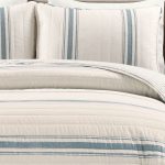 This Farmhouse Stripe Reversible Cotton Quilt Set includes a reversible 100% cotton quilt and 2 matching reversible pillow shams. The background color is a creamy off-white color. The quilt and the sham in this Farmhouse Stripe Reversible Cotton Quilt Set are both safe to machine wash and tumble dry. For best results, please refer to the product labels for full care instructions.